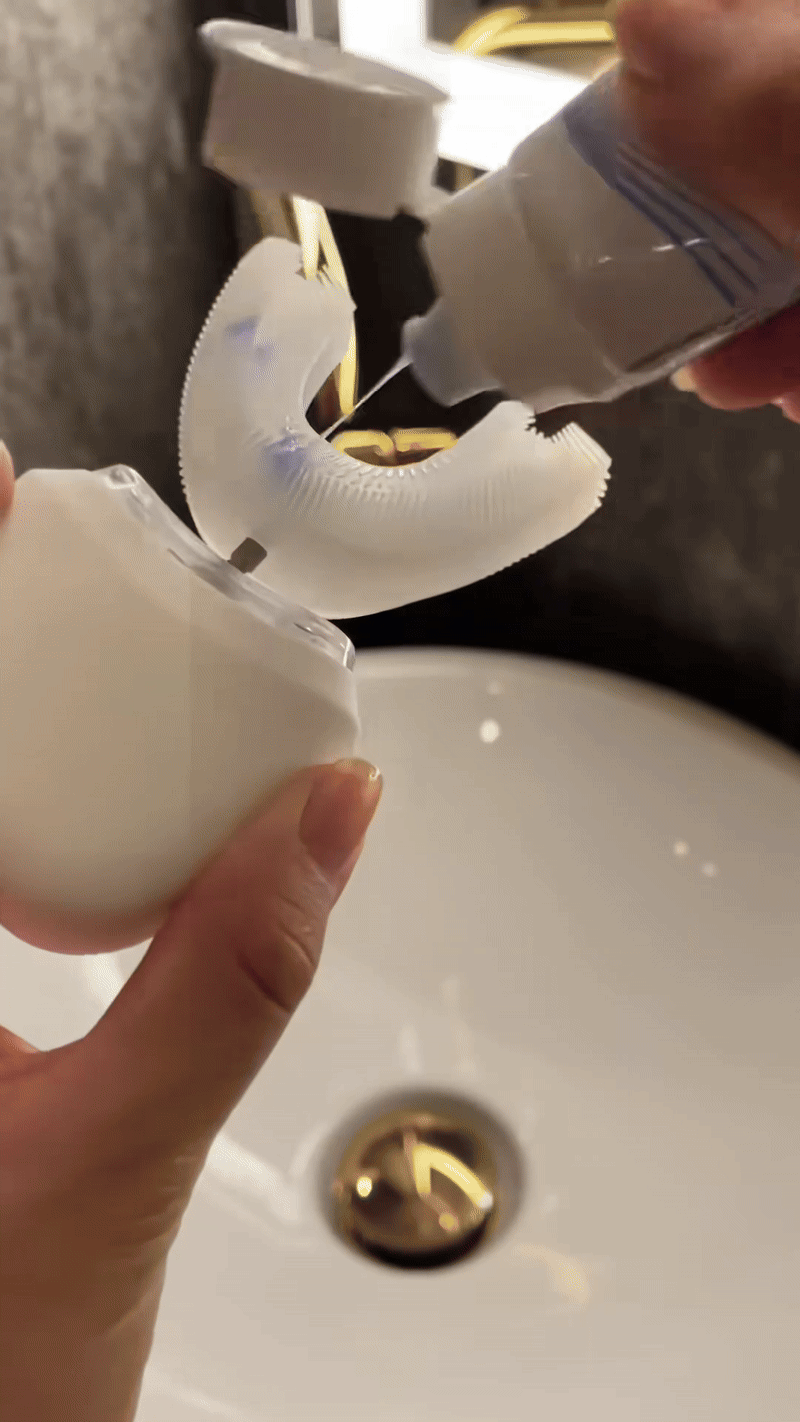 Shake your liquid or foam toothpaste and spread it evenly across the U-shaped silicone brush head.